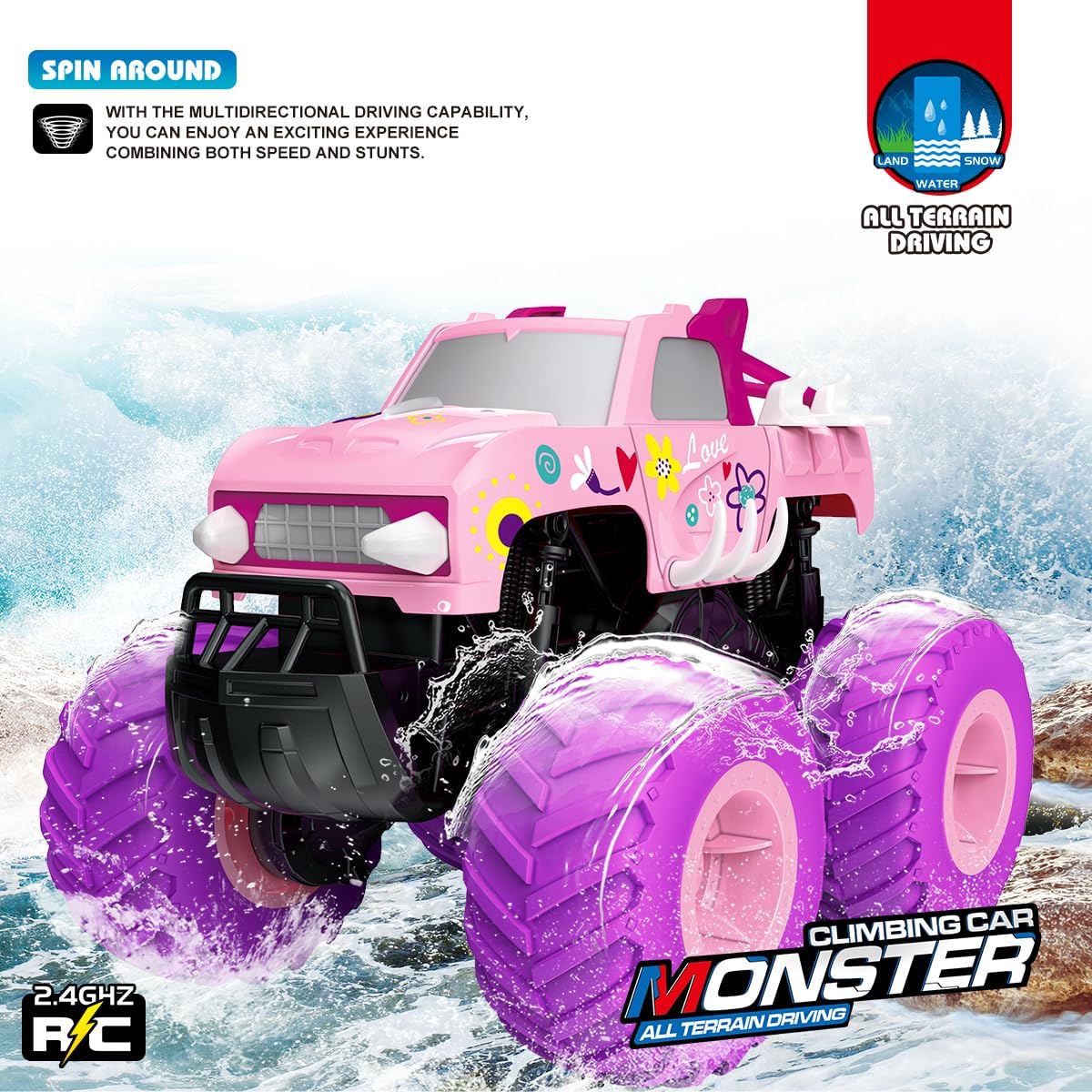 Threeking RC Pick-up Toys Gifts Presents for Kids Ages 6+.///Waterproof body,can easily pass various terrains, even in water and rain.///The remote is not waterproof.